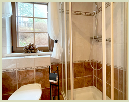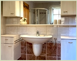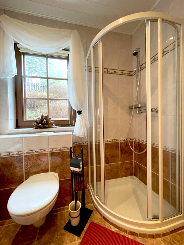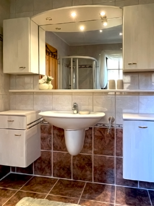 Tageslichtbad, neuwertige, helle Badmöbel, Eck-Dusche, Handtuchheizkörper,